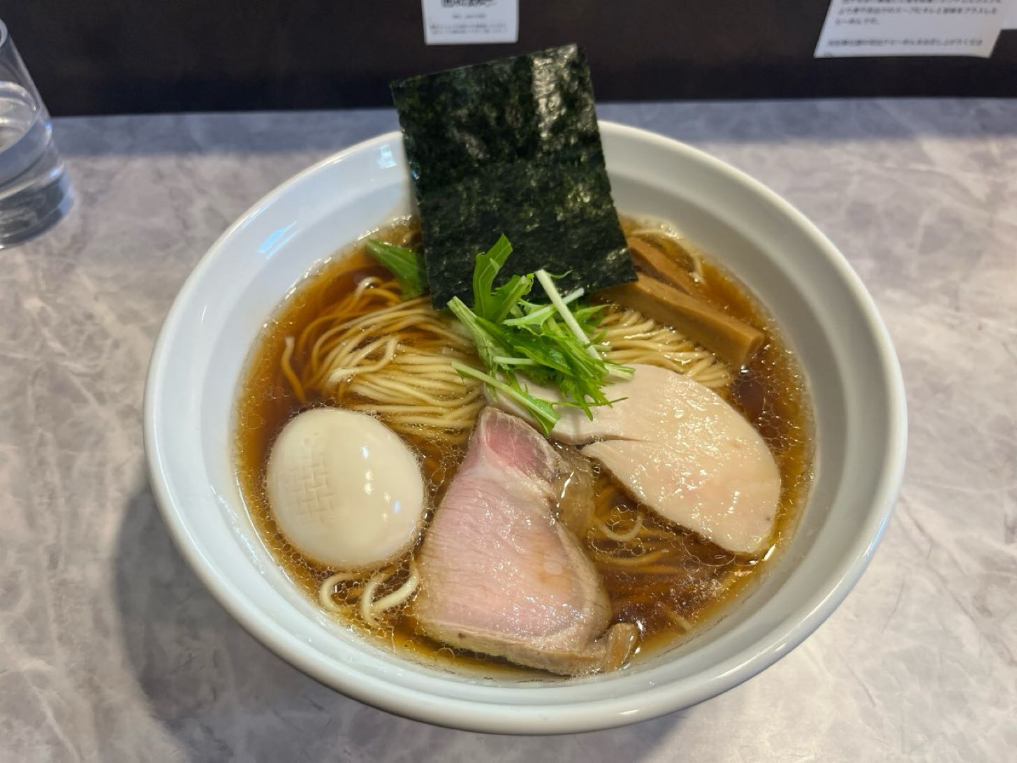マイルド煮干と貝出汁のジワジワうまいスープ。滑らか細麺が合う。味玉も程よい味染み。