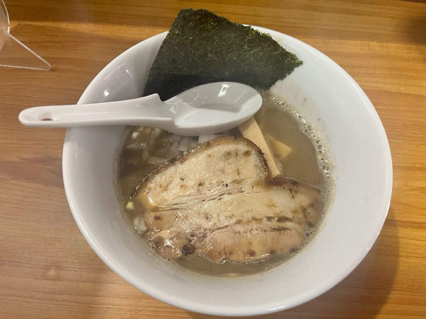 見た目からニボニボしいスープなんだけど、煮干というより鮮魚感あるスープ。ツルパツ細麺を啜るとインパクト十分。うまい