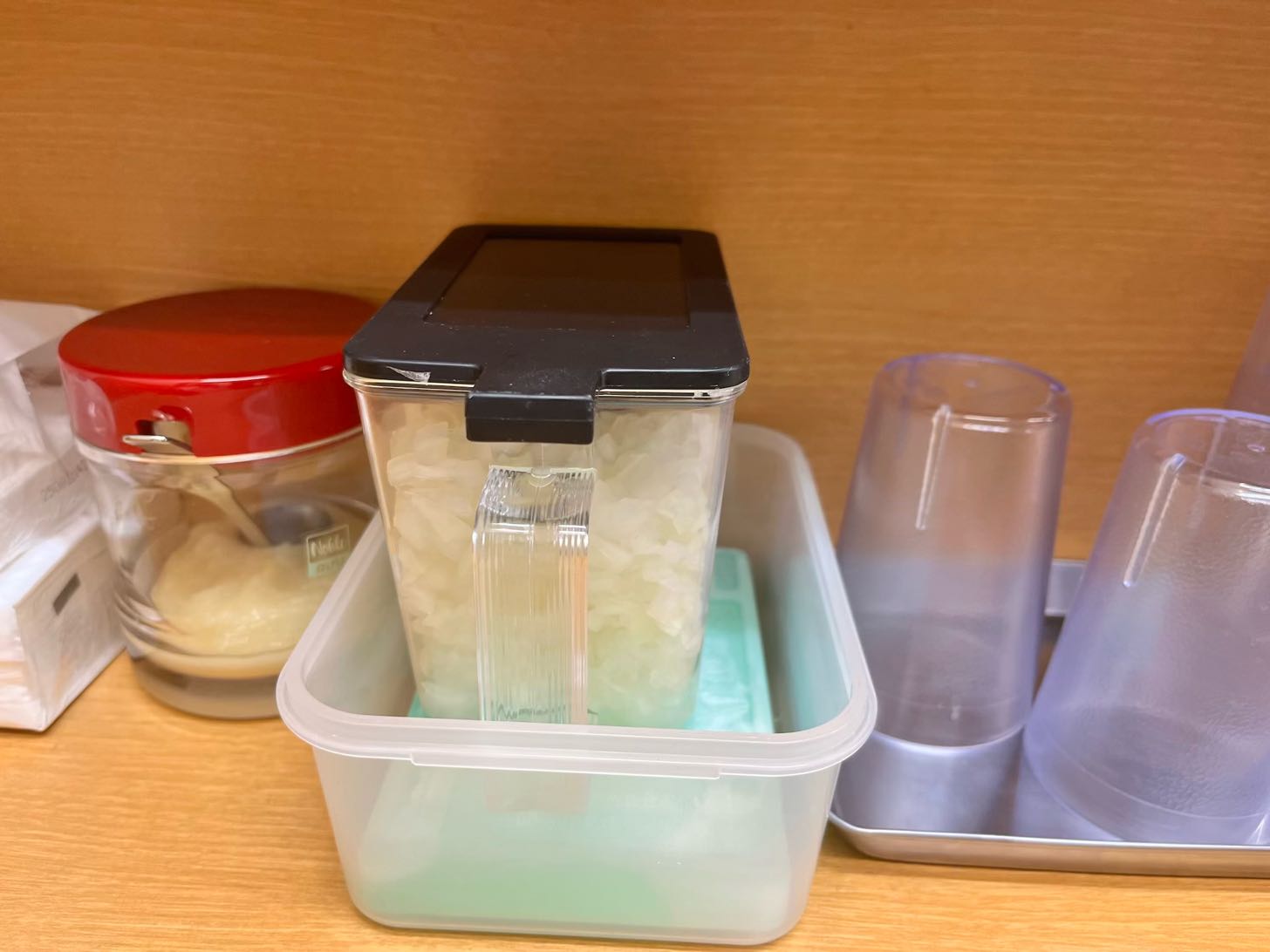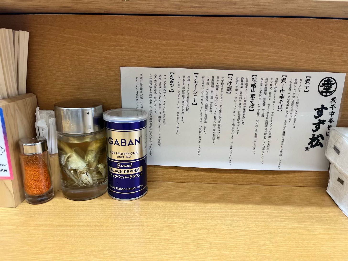 タマネギとか煮干酢とかニンニクとか卓上が充実してる。
